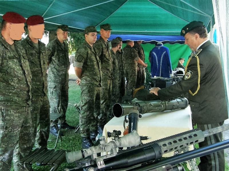 Veliteľ Ps OS SR sa zaujíma o statickú ukážku ručných zbraní a materiálu OS SR,